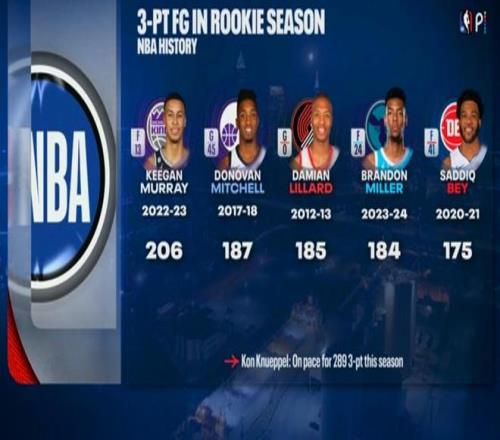 按照克努佩尔如此高产的三分投射表现,只要保持健康打完新秀赛季,他也将大幅刷新NBA新秀赛季历史三分榜。