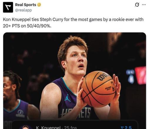 在场均出手8.5记三分的情况下,克努佩尔保持着40.9%的超高三分命中率,本场也是克努佩尔本赛季第11次单场以三项命中率至少50/40/90%砍下20+,成功追平库里保持的新秀赛季纪录并列NBA历史第一。