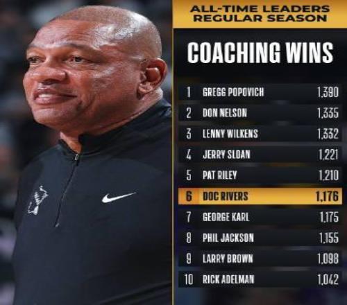 里弗斯执教胜场数来到1176场,升至NBA历史第六位